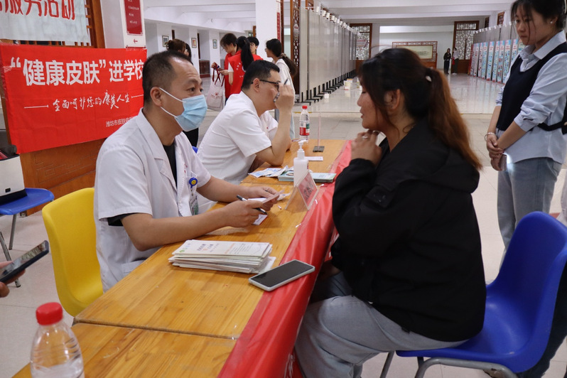 公益讲座中,由潍坊市皮肤病防治所主任徐峥带队的专家团队,聚焦大学生常见皮肤问题,围绕痤疮的认知误区、发病机制及防治方法等内容进行讲解,结合临床案例,解答“为何反复长痘”“日常如何护理”等热点问题,现场互动积极,气氛活跃。讲座后,义诊活动在乐道济世书院有序开展。专家为同学们进行面部检查、分析个体情况,从用药、饮食、作息及护肤等方面提供个性化建议,并发放护理手册,帮助学生增强健康管理意识。