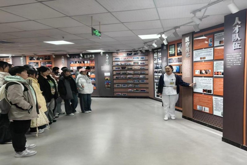 活动中,眼科中心副主任医师牟莹莹、副护士长牟亚男及眼视光专业技师荆霖组成专业讲解团队,为同学们带来了一场内容翔实的专业启蒙课。三位老师结合临床案例与行业发展,系统梳理眼科中心的发展历程与重大突破,生动讲述眼科学发展史,逐一介绍各类眼科检查、诊疗设备的功能原理与操作规范,将抽象的专业知识转化为直观的实物讲解。活动尾声,全体师生在眼科中心门前整齐列队,共同庄严宣读“德之光华,取之明道”的科室理念,洪亮的声音传递出对医学职业的敬畏与追求。