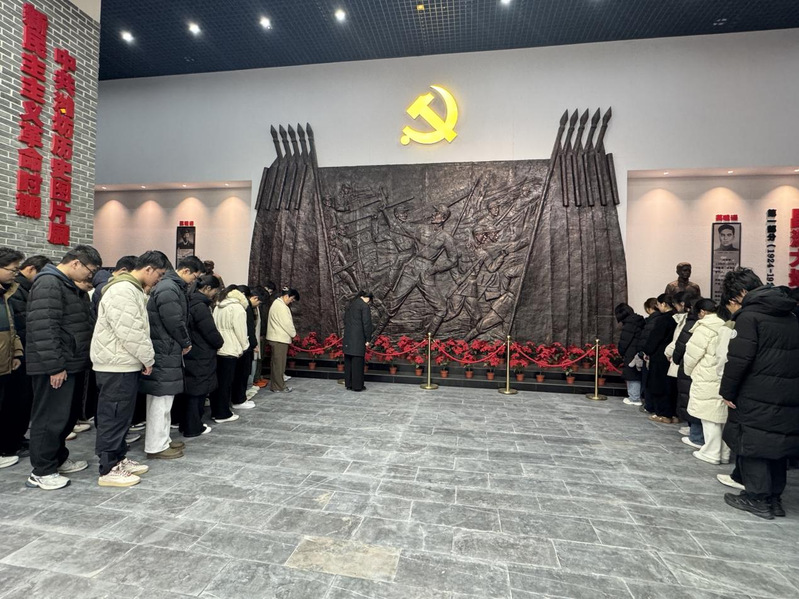 活动在庄严的烈士纪念馆内正式开始。全体师生齐唱国歌,肃立默哀,向为国家和民族解放事业英勇献身的革命先烈表达深切哀悼与崇高敬意。学生代表韩旭在发言中表示,作为新时代青年,必将铭记历史、继承遗志,以实际行动践行报国之志。在讲解员的生动讲述中,师生们系统学习了潍坊地区党组织创建与发展的光辉历程,重温了抗日战争时期潍县大地的烽火岁月,以及潍县战役胜利迎来潍坊解放的壮阔历史。通过一幅幅珍贵图片、一件件历史实物、一段段感人故事,大家深刻感悟到革命先辈坚定的信仰与不屈的斗争精神。参观结束后,全体师生专程前往2025年最美医生、中国好医生、见义勇为勇士、齐鲁时代楷模、山东省道德模范、优秀校友张军桥烈士的墓前,举行简朴而隆重的缅怀仪式。众人静默肃立,垂首默哀三分钟,向这位在岗位上无私奉献、不畏牺牲的白衣战士表达深切怀念与无限敬意。